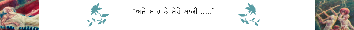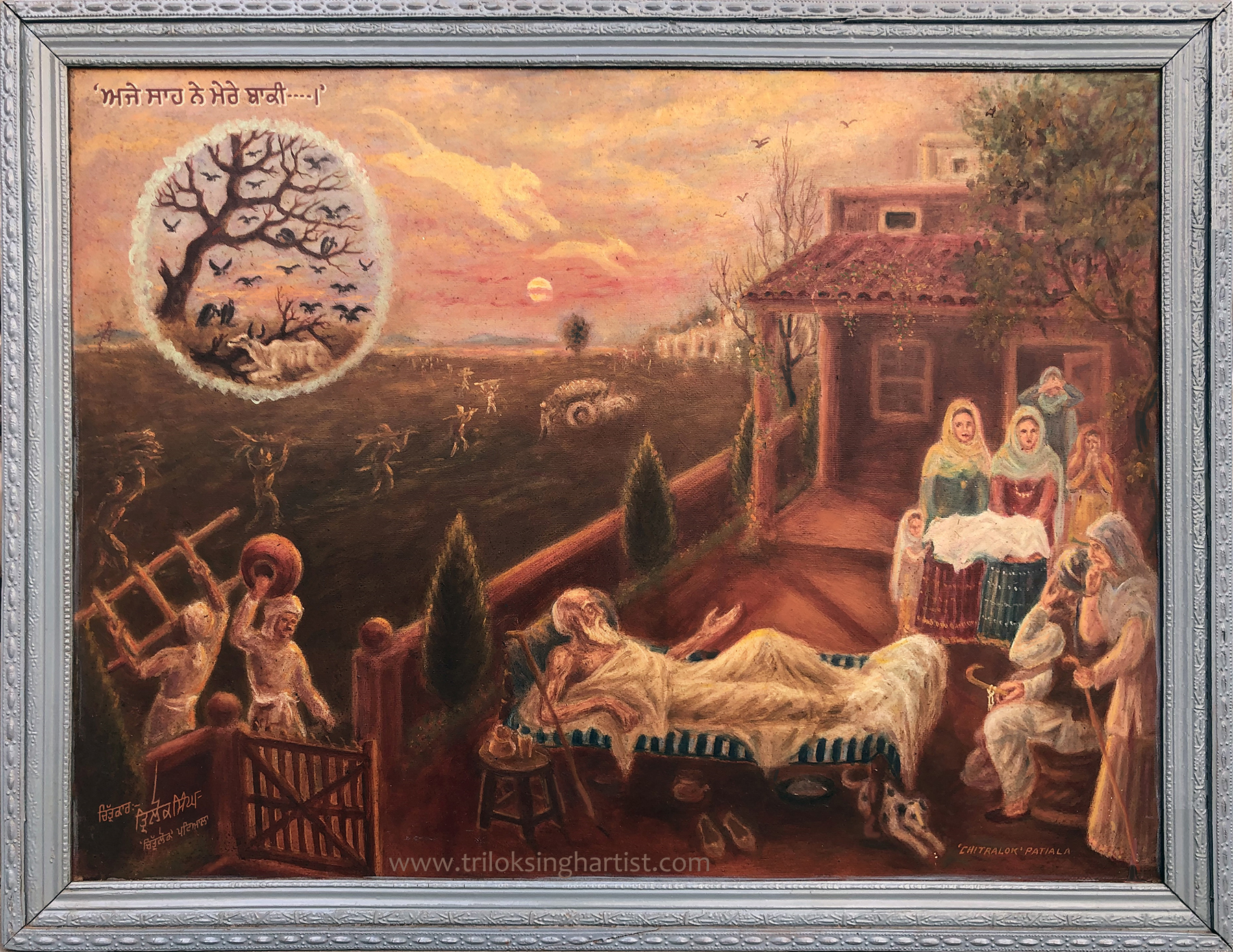 This painting depicts the line of a poem “ There is still some breath (life) left in me…….ਅਜੇ ਸਾਹ ਨੇ ਮੇਰੇ ਬਾਕੀ।...” In the scene a very old man is lying on the bed. He may die any time. His family members think that if he dies before sun-set, then they will cremate him on the same day. They have brought a new dress ( a coffin) to be worn by him.