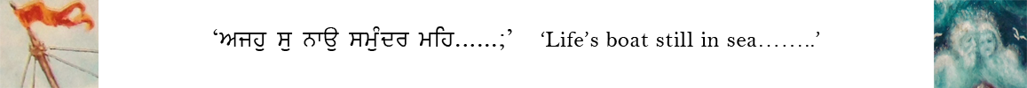 This scenic painting is based on Bhagat Kabir's line in Gurubani ਅਜਹੁ ਸੁ ਨਾਉ ਸਮੁੰਦ੍ਰ ਮਹਿ ਕਿਆ ਜਾਨਉ ਕਿਆ ਹੋਇ ॥ That life’s boat is still in the water and person is unaware what is going to happen in the coming times.