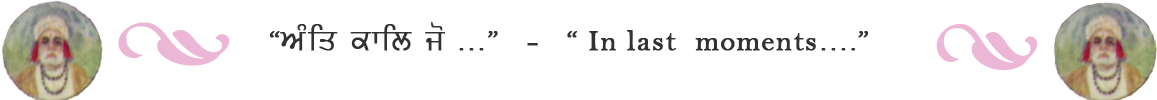 The artist beautifully illustrated the Shabad of Bhagat Tirlochan about a person who thinks of wealth, women, sons, structures, God etc at the time of death and what happened to him.