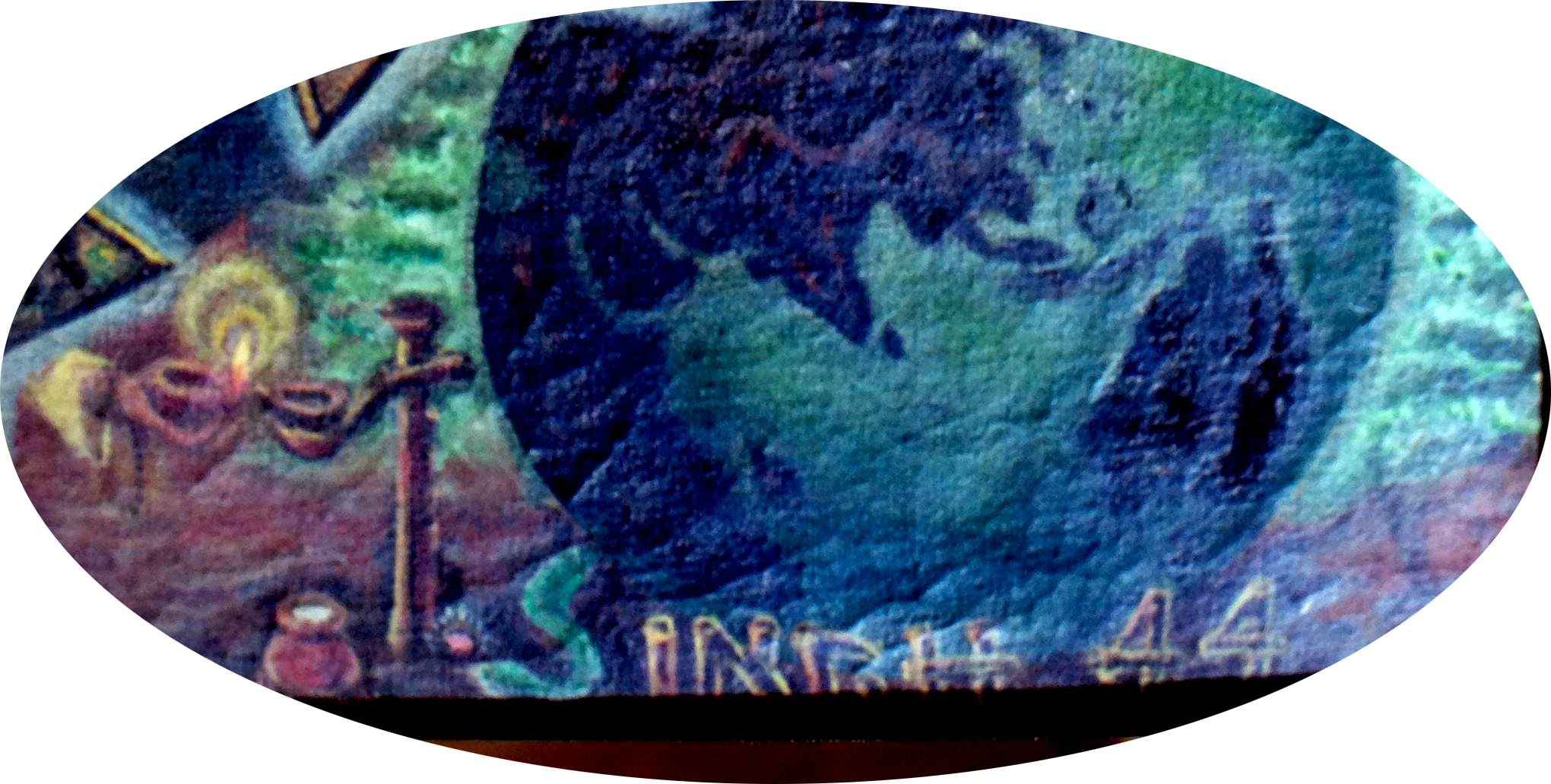 The Artist has written his name in very unique style. He has placed lamp ( Diya) on wooden stand in shape of T( Trilok Singh). He very humbly prays to Guru Nanak to enlighten his mind by lighting his lamp of knowledge and devotion.