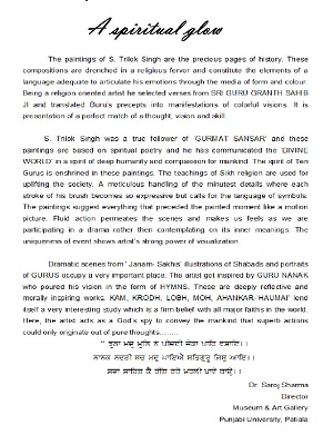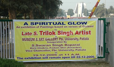 A SPIRITUAL GLOW An Exhibition of Paintings based on verses of Gurbani by Late S. Trilok Singh Artist in Museum and Art Gallery, Punjabi University, Patiala was inaugurated by S. Swaran Singh Boparai, Kirti Chakra, Padam Shree (awardee) on 19-12-2006. The Exhibition remained opened till 22-12-2006. Dr. Saroj Sharma, Director, Museum and Art Gallery arranged the show. The V.C has given beautiful views about the Artist.Punjabi University printed invitaion cards on this occasion.