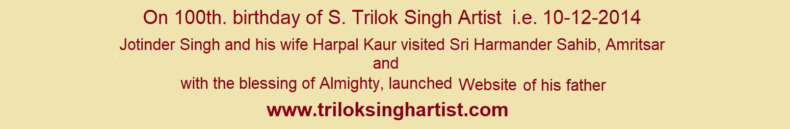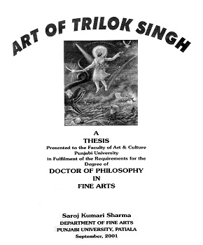 Jotinder Singh and his family is thankful to Dr. Saroj Kumari Sharma, Director , Museum and Art Gallery, Punjabi University Patiala and his husband Colonel Sharma. They did hard work dedicatedly in research for the degree of Doctor of Philosophy. Ph.D degree was awarded on "ART OF TRILOK SINGH" S. Trilok Singh Artist is the first Punjabi Artist on whose works the Ph.D degree was awarded.