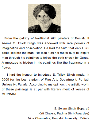 A Gold medal in the name of S.Trilok Singh Artist was established and awarded for the topper of M.A Fine Arts. On that ocassion S. Swaran Singh Boparai , Kirti Chakra Padma Shri , Vice Chancellor , Punjabi University, Patiala chaired the function. Er. Jotinder Singh s/o the Artist donated cheque in Endowment fund for the Gold Medal. The VC honoured Jotinder Singh with a pack of books. In the function Jotinder Singh's wife Harpal Kaur and daughter Dr. Upinder Kaur were also present. Dr. Saroj Kumari Sharma, Dr. Saroj Chaman and Head of faculty of Fine Arts and Culture Mr. Narula, Dr. DS Grewal, Dean S. Parmhans Singh and collegues from PSEB were present.