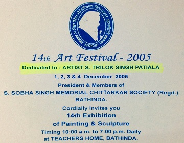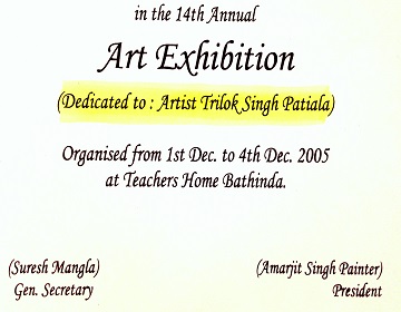 52nd All India 52nd. All India Sikh Educational Conference held at pologround Patiala 1992. They dedicated the Art section to late S.Trilok Singh Artist Chitralok, Patiala. The works of the ArtistTrilok Singh were displayed there for 3 days the exibition. The exhibition was inaugurated by S. Gurcharan Singh Tohra, President, SGPC , Amritsar and Principal S.Satbir Singh.