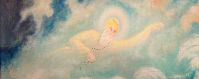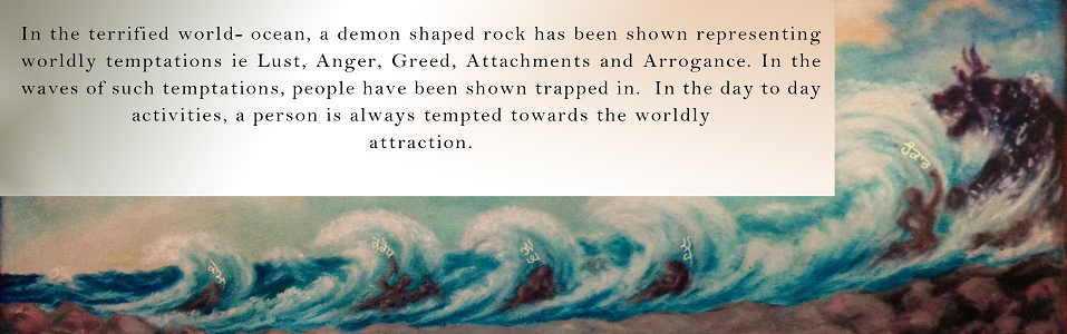 In the painting, The Artist has shown Guru Nanak in sky and guiding how to swim smoothly across the world-ocean by keeping God’s name in heart to lead a true life to attain salvation.