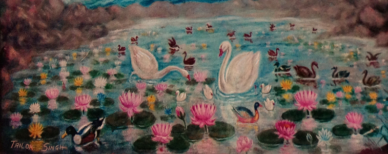 This beautiful painting is based on Gurubani ‘ Like lotus flower floats and the duck swims through the stream. Similarly, one crosses over the terrifying world- ocean with one’s consciousness focused on the God’s name.’