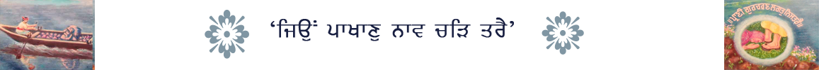 As the person, who sits in the boat and can reach the destination with the help of sailors. so does a person with Guru’s grace attains salvation has been beautifully depicted in this scenic painting. The Artist has shown two sailors are rowing the boat having stones therein. There a huge stone (the face of a person) lying in the boat. Usually the stone being heavy drowns in the sea. These stones can reach other side of river if are carried in a boat. In one corner, small beautiful flowers are shown symbolizing the beautiful temptation surrounding the person for attraction. The birds are also seen flying from one side of the sea towards the other. They also reached their destination, keeping God in mind. Similarly, ‘gqkDh r[ouoD brs[ fB;so?’, a person with God’s grace can also lead a worthy life. If he sincerely believes in God and with the help of Guru, he can also cross world- ocean unaffected. He can also be saved from the cycles of birth and death.