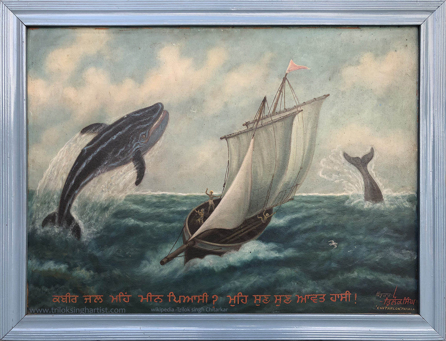 It is amusing to know that fish living in water is still thirsty. This scenic painting is the illustration of Kabir bani.