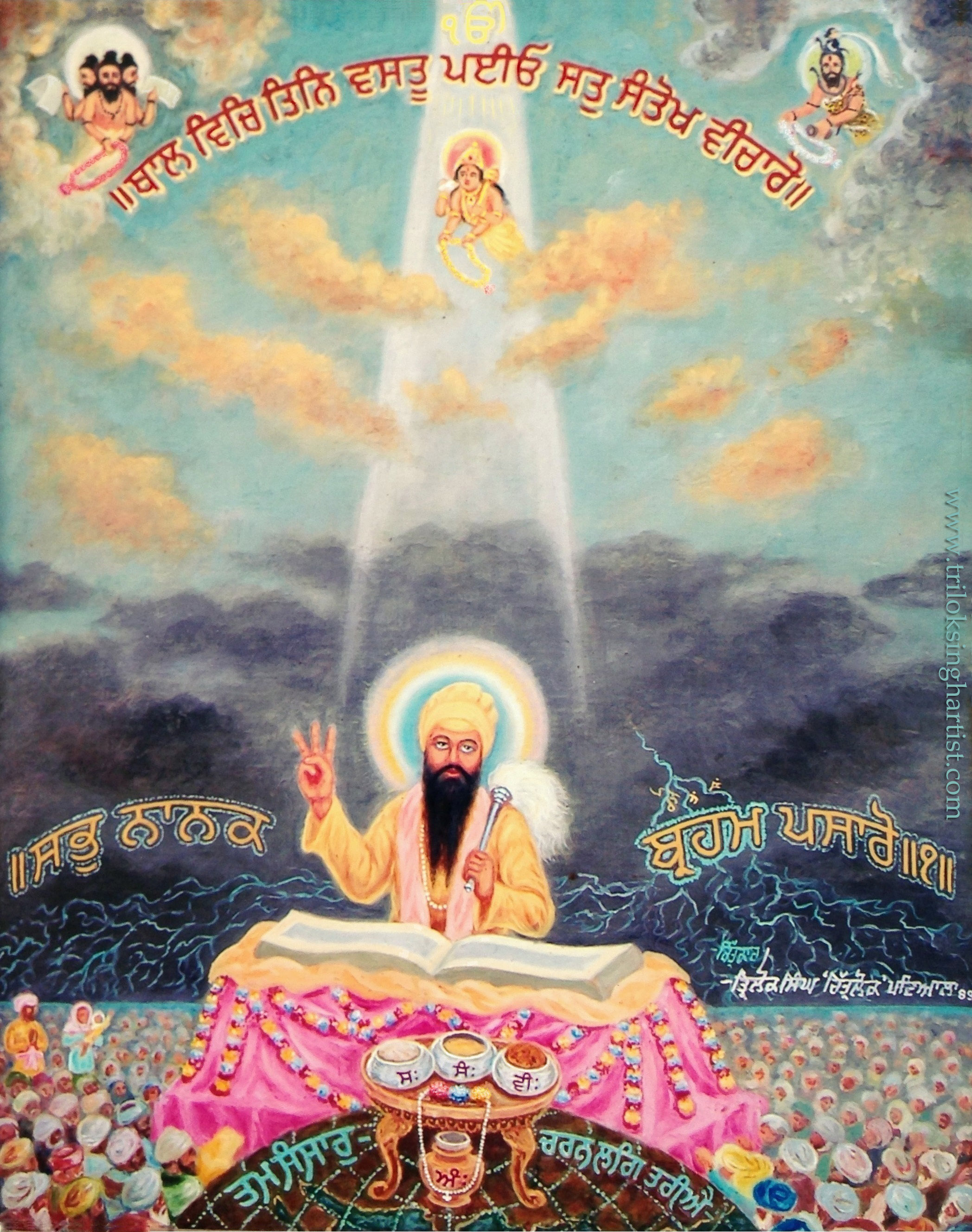 In the painting, the Artist has shown the Guru. The light emanating from “Ek Onkar’ at the top is spreading through the Guru into the Guru Granth Sahib. It symbolizes that Guru’s message is in the holy book. In one plate, three bowls serving Sat (truthful character), Santokh (Contentment), Vicharo (meditation to reach the lord) are lying. Below them is one bowl of Nectar. These three are boned together like the thread keeping different beads together. God has created the whole universe. He Himself is present in everything created by Him. It is up to the human beings to place themselves at the Guru’s feet, get His blessings and attain salvation in the life. Total surrender to His will is the solution to all the problems.